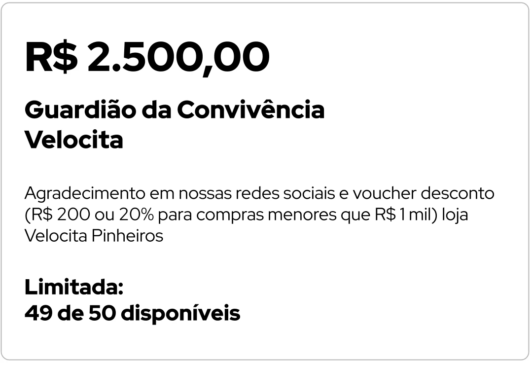 agradecimento em nossas redes sociais e voucher de desconto em estabelecimentos parceiros4. Guardião da Convivência - R$ 2.500,00