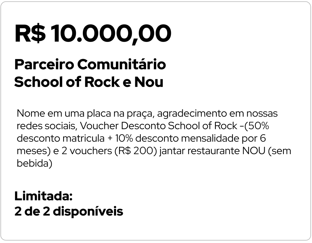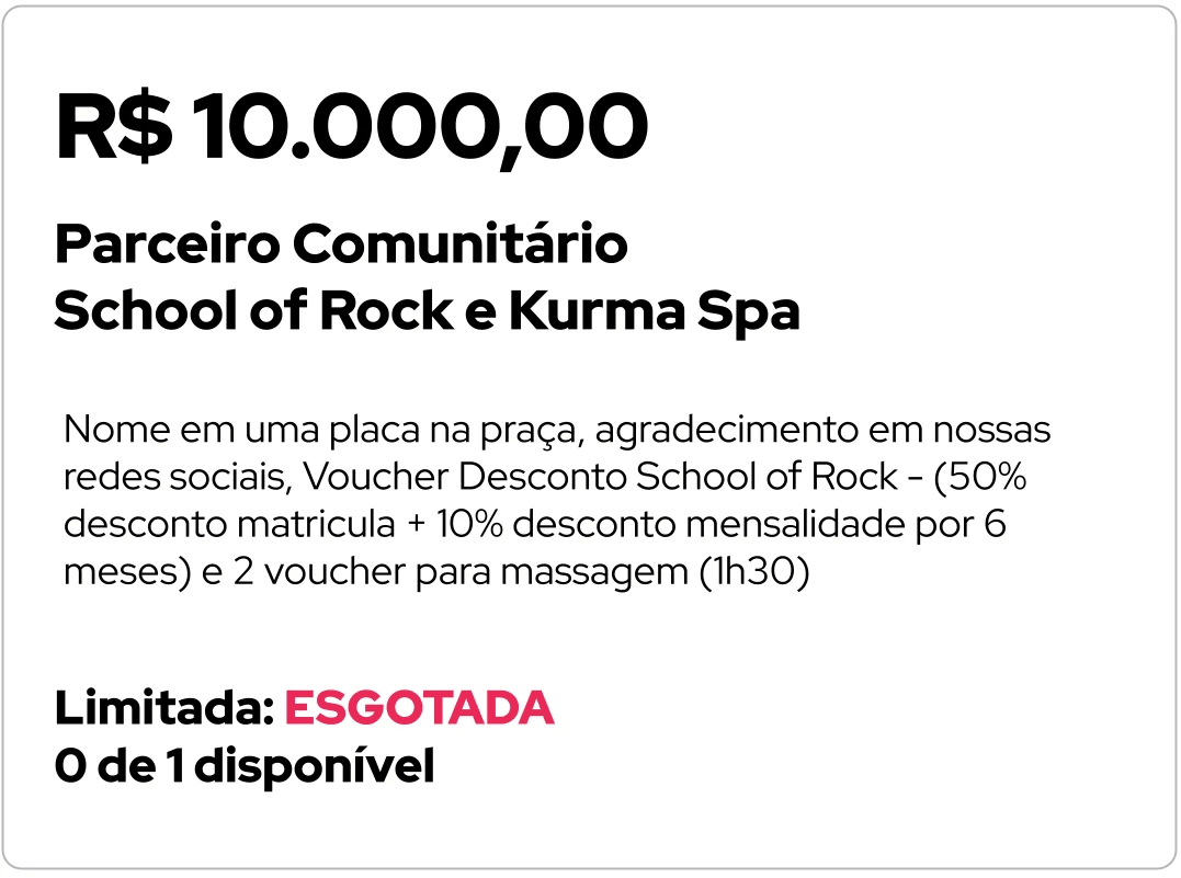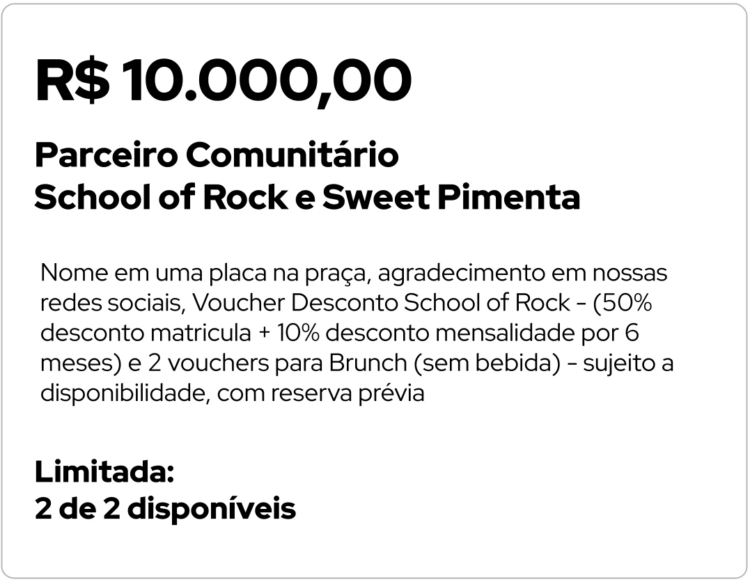 Nome em uma placa na praça, agradecimento em nossas redes sociais e voucher de desconto em estabelecimentos parceiros6. Parceiro Comunitário - R$ 10.000,00