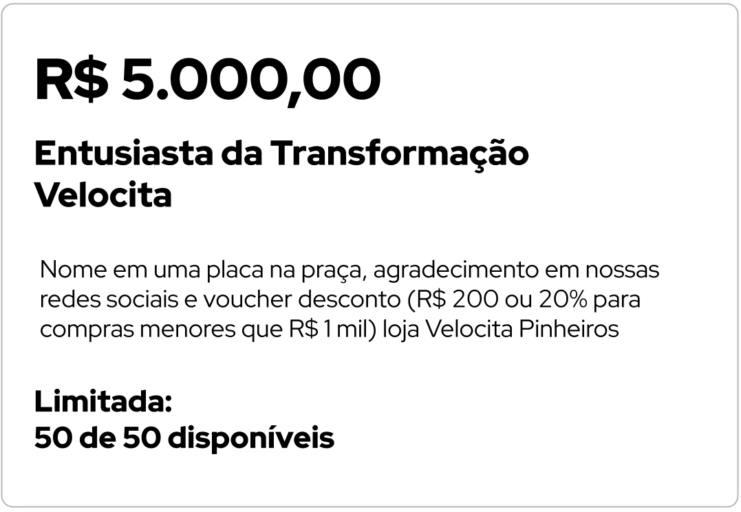 agradecimento em nossas redes sociais e voucher de desconto em estabelecimentos parceiros5. Entusiasta da Transformação - R$ 5.000,00