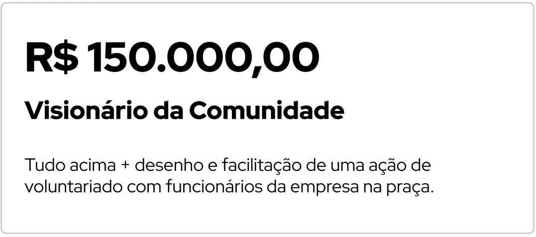 Tudo acima + desenho e facilitação de uma atividade especial na praça para crianças, por exemplo, filhos de funcionários5. Visionário da Comunidade - R$ 150.000,00