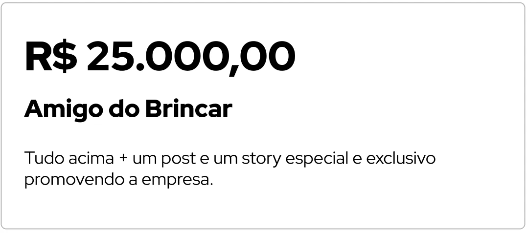 Logo em materiais digitais e agradecimento coletivo nas nossas redes sociais2. Amigo do Brincar - R$ 25.000,00